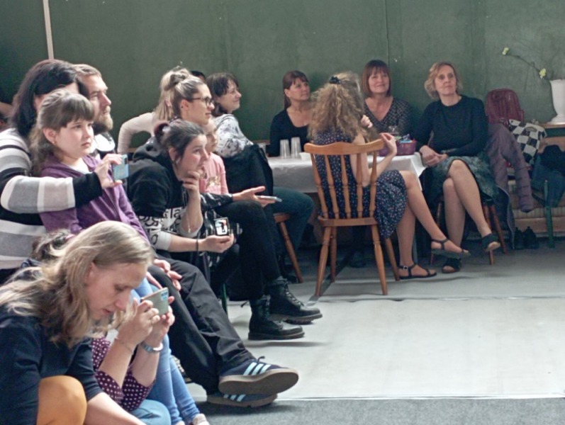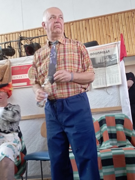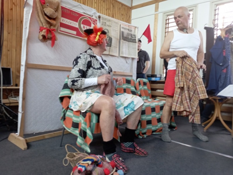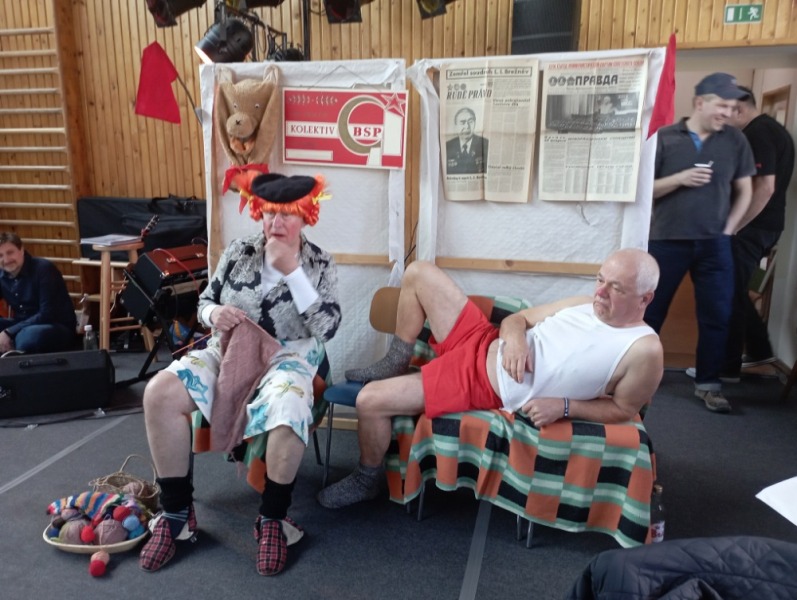 Poté se k potěše oka sledujících na scéně objevil pokoj ze 70. let minulého století se vším všudy, dobovými obrázky, televizí a válendou. Na židli spočinula švarná paňmáma (M. Horák) s mohutnými přednostmi a přesně taková, jak si s nadsázkou vybavujeme ve vzpomínkách na ta dávná léta – v pěkných barevných ponožtičkách a kostkovaných bačkorách s přezkou, v ruce pletení, vlásky rezaté, klobouček elegantní, nožky vypracované. Taťka (J. Kozák) byl také fešák, stál tu před námi ve slušivých červených trenýrkách, kostkované košili, s pestrou kravatou, zkrátka byla to taková z gruntu šik dvojice, která vedla dialog na téma Vysockého básně a obecenstvo se válelo smíchy. Ze scény je vyprovázel bouřlivý potlesk a pak už se všichni těšili na zlatý hřeb programu – vystoupení Osovských chlapů (OCH).